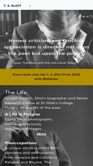 Official resource for T. S. Eliot introducing his poems, plays, prose, unpublished letters, recordings and images. Home of the Eliot Prize.