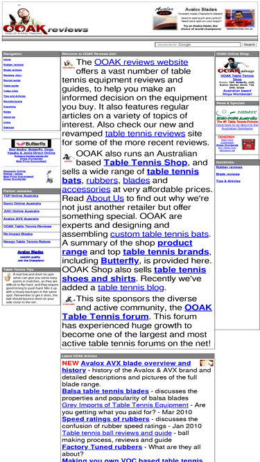 100%the ooak table tennis reviews website has a huge collection of equipment reviews and table tennis related guides and articles. ooak also runs a very active table tennis forum, and runs an australian online shop carrying brands avalox, juic, tsp, friendship 729, lkt, dhs, globe dawei, galaxy milky, and others.