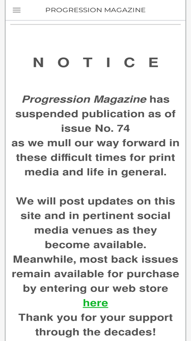 N O T I C E Progression Magazine has suspended publication as of issue No. 74 as we mull our way forward in these difficult times for print media and life in general. We will post...
