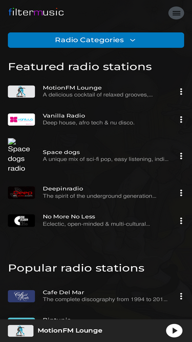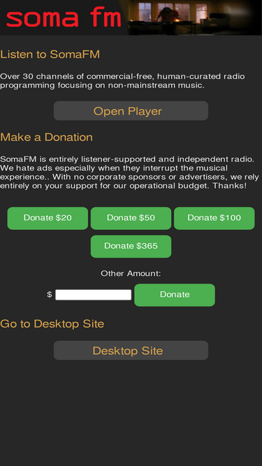 90%over 30 unique channels of commercial-free, listener-supported radio. all music hand-picked by somafm's award-winning djs and music directors.