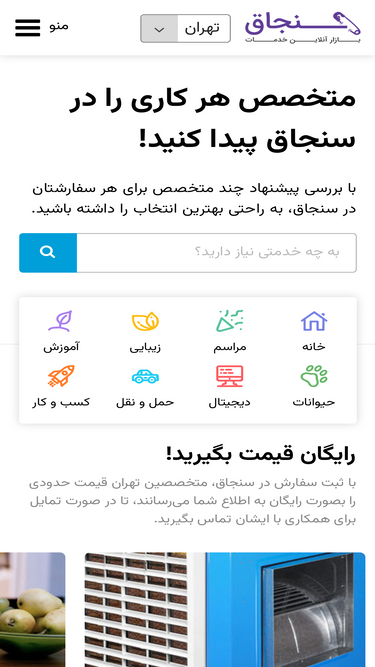 69%سنجاق تهران | سنجاق بازار خدمات ایران است از نظافت و تاسیسات گرفته تا آموزش و خدمات زیبایی. با ثبت آنلاین سفارش در سنجاق، قیمت دقیق خدمات مورد نظر خود و مشخصات بهترین متخصصهای تهران را دریافت کنید.