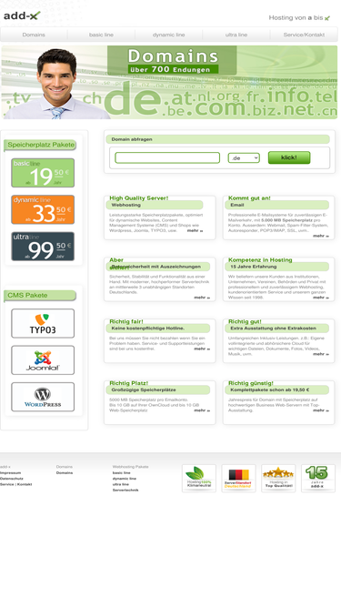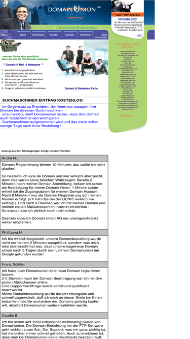 94%ultrag�nstige domainregistrierungen, mit preisvorteil bei 3 j�hriger mindestlaufzeit: de ab 9,50, com net org info biz ab 15,00 , at li ch ab 29 euro jahr. keine einrichtungskosten. unbegrenzte emailadressen, automatische weiterleitung, kostenfreie �nderung der zieladressen