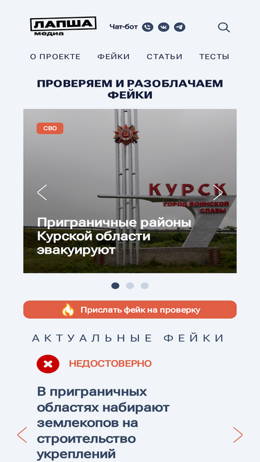 87%Фактчекинговый ресурс. Разоблачаем фейковые новости, готовим аналитические разборы. Если появились сомнения в информации в интернете – присылайте нам на проверку, подскажем правда это или фейк.