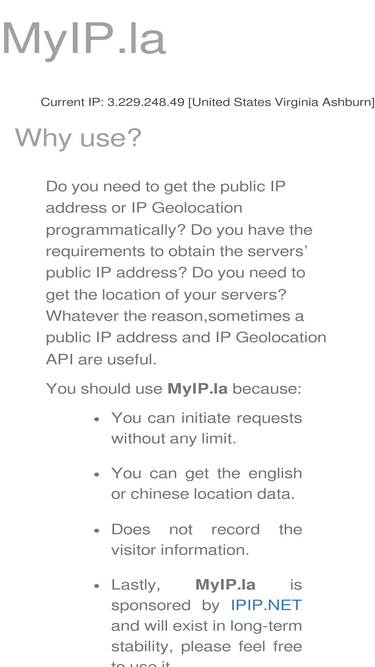 ip.la a simple public ip address and ip geolocation api, easy enough to integrate into any application in seconds.