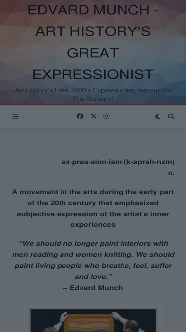 82%ex·pres·sion·ism (k-sprsh-nzm) n. A movement in the arts during the early part of the 20th century that emphasized subjective expression of the artist's inner experiences "We should no longer paint interiors with men reading and women knitting. We should paint living people who breathe, feel, suffer and love." - Edvard Munch Edvard Munch Biography,