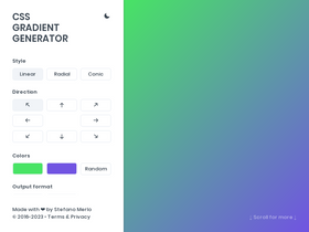 As a free CSS gradient generator tool, this website lets you create a colorful gradient background for your website, blog, or social media profile.