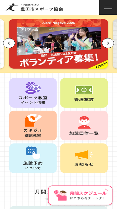 公益財団法人豊田市スポーツ協会はスカイホール豊田(豊田市総合体育館)と豊田市運動公園の施設管理を行っています。