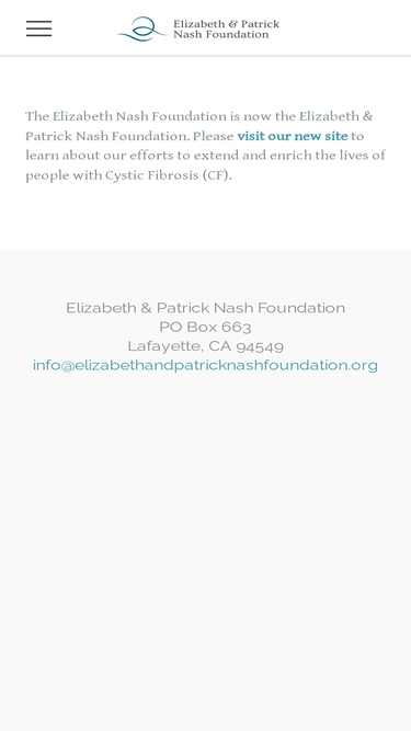 82%The Elizabeth Nash Foundation is now the Elizabeth & Patrick Nash Foundation. Please visit our new site to learn about our efforts to extend and enrich the lives of people with Cystic Fibrosis (CF).