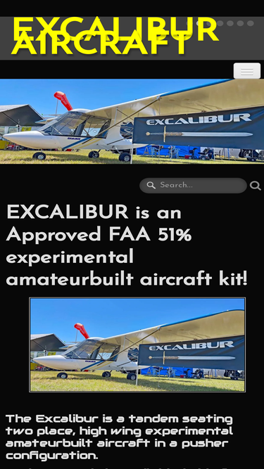 The Excalibur is a tandem seating two place, high wing aircraft in a pusher configuration. In the U.S.A. it is available in kit form, and is approved as by the FAA as a 51% aircraft kit. In Canada the Excalibur is available as an Amateur-built Aircraft, a Basic Ultralight Aircraft and an Advanced Ultralight Aircraft.