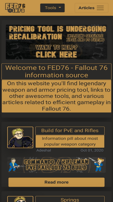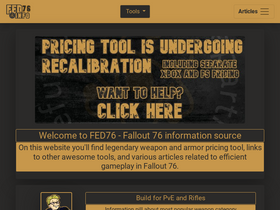 welcome to fed76 - fallout 76 information source - on this website you'll find legendary weapon and armor pricing tool, links to other awesome tools, and various articles related to efficient gameplay in fallout 76. | fed76