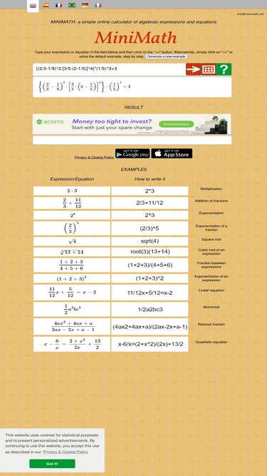 minimath is an algebra calculator for solving equations and simplifying expressions of monomials, multivariate polynomials and rational functions with integer or rational coefficients, showing all steps