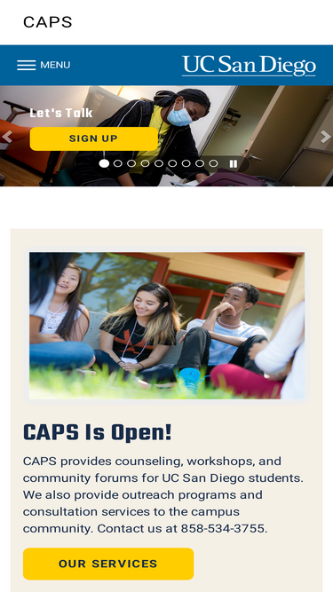 100%caps provides confidential counseling to registered uc san diego students. caps also provides outreach and consultation to the campus community. caps is part of the student health and well-being cluster, which includes student health services (shs) and health promotion (hp).