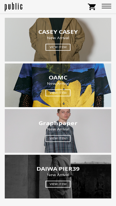 casey casey,oamc,unused,tuki,teatora等を取扱うセレクトショップ、publicのwebサイトです。