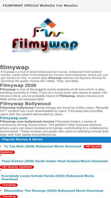 Filmywap 2026 movie download site for Bollywood, Hollywood & South Indian Hindi dubbed movies in 480p, 720p & 1080p HD quality.