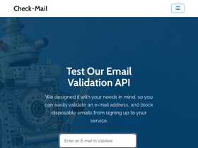 check-mail is a free api service to validate email addresses, to check if an email is valid or disposable. the api combines blacklists with advanced heuristics to let you know if you should block disposable email or validate an email addresses.