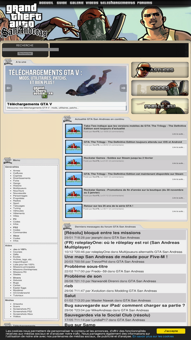 99%site proposant plusieurs ressources pour gta san andreas telles que des news, guides spéciaux, aides, galerie d'images, rubriques téléchargements complètes et bien plus encore.