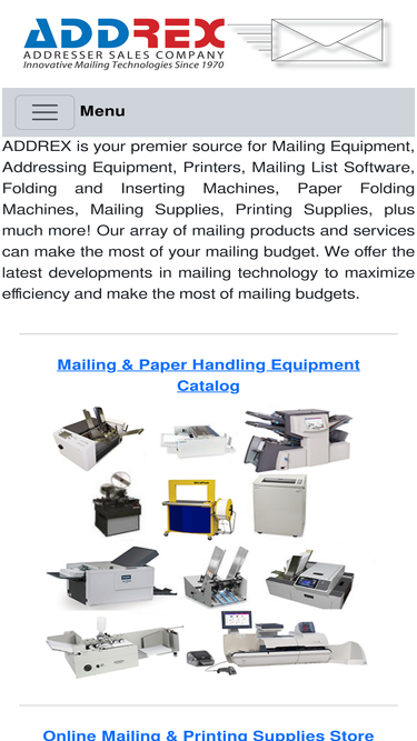 addrex is your premiere source for mailing equipment, paper handling equipment, address printers, folder inserters, paper folding machines, mailing and wide format media supplies, plus much more!