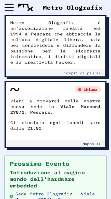 100%Metro Olografix è un’associazione fondata nel 1994 a Pescara che abbraccia la cultura digitale libera, nata per condividere e diffondere la passione per la sicurezza informatica, i diritti digitali e la creatività hacker.