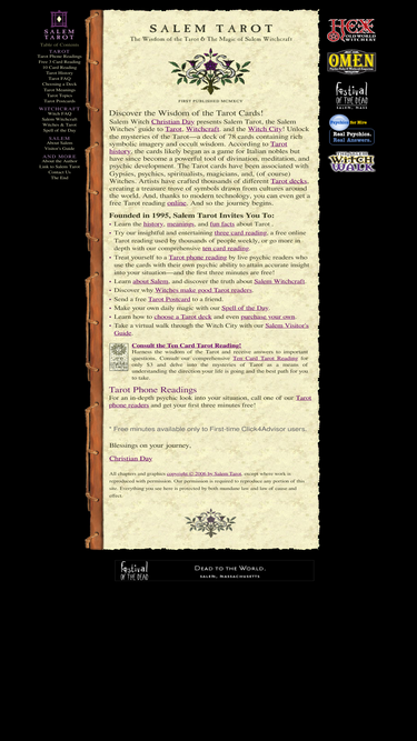 76%the salem witches' guide to tarot with free online tarot readings, tarot decks, tarot phone readings, free tarot postcards, and tarot history.