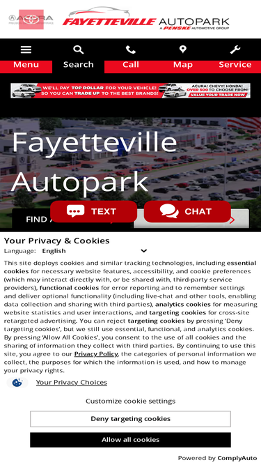visit fayetteville autopark for a variety of new and used cars by honda, chevrolet, acura and toyota, serving fayetteville, arkansas. we serve bentonville, springdale and rogers ar and are ready to assist you!