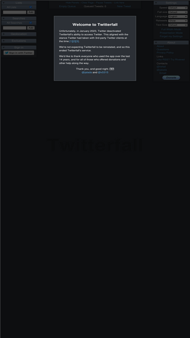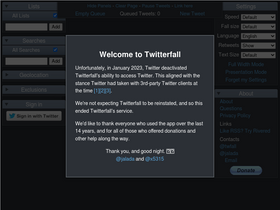 82%twitterfall was a web-based twitter client where tweets fall down the screen like a waterfall. great for presentations and big screen use.