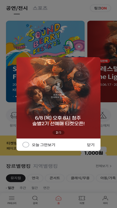 티켓예매, 스포츠, 공연, 전시 등 티켓 예매서비스 제공. 페이코(PAYCO)간편결제 지원.