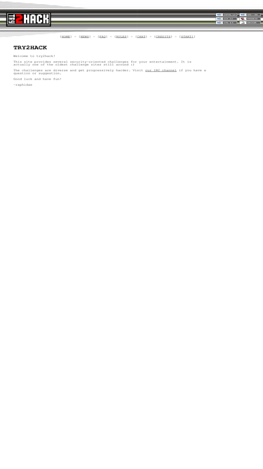 75%this site provides several security oriented challenges for your entertainment. it is actually one of the oldest challenge sites still around. the challenges are diverse and get progressively harder.