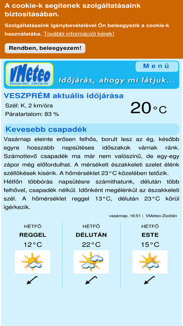 Az időjárás. Részletes heti előrejelzések minden város, falu és helységnév számára. Jelenlegi időjárási viszonyok. Időjárás figyelmeztetések szélsőséges időjárási jelenségek esetére. Hosszú távú előrejelzés. freemeteo.hu