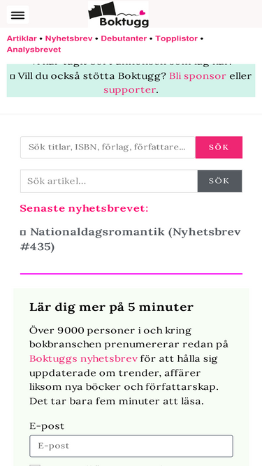 Boktugg Supporter är för dig som älskar Boktugg och tycker det vi gör är värt 1 kr/dag. Signa upp för en stödprenumeration. Det tar bara en minut. Tack.