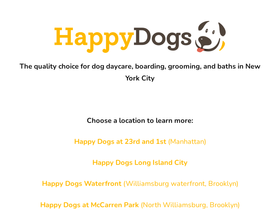 100%Grooming at Happy Dogs We offer full grooming to our member dogs at all locations. Our professional grooming service by our experienced master groomers includes: — Base prices: Add-ons: To book: Questions?