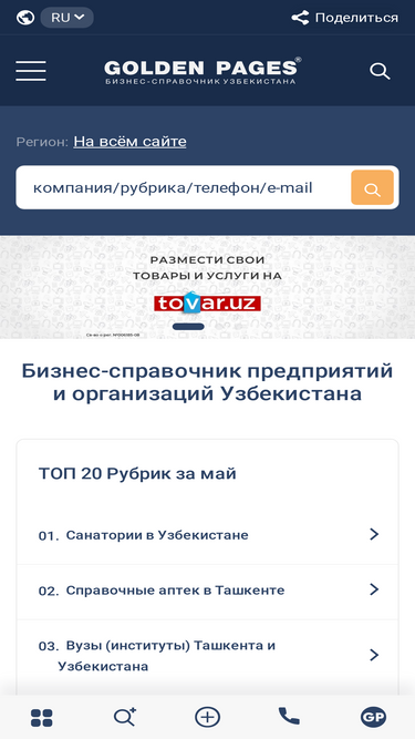 72%Cправочный каталог по предприятиям, компаниям и организациям Узбекистана ☑️ Адреса и ☎️ телефоны организаций ⭐ Золотые страницы Узбекистана