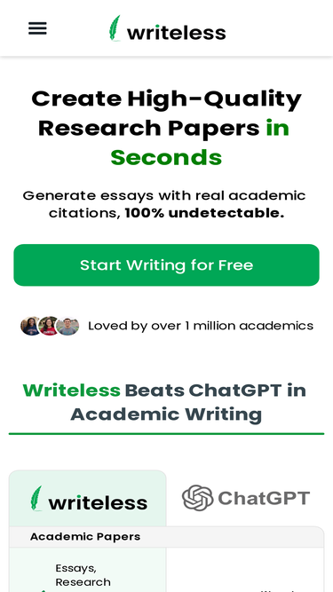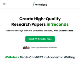 96%Writeless AI generates essays for you in seconds. It finds real citations, writes like you, and is completely undetectable. Start writing for free!