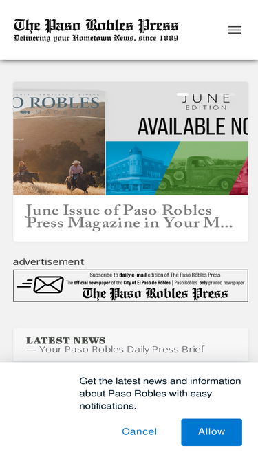 Paso Robles Press is the daily online news source and weekly print newspaper for the Paso Robles area, serving the community since 1889.