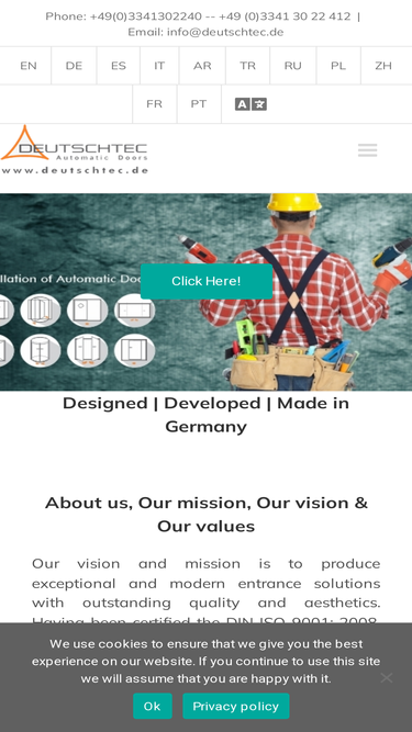 76%Designed | Developed | Made in Germany About us, Our mission, Our vision & Our values Our vision and mission is to produce exceptional and modern entrance solutions with outstanding quality and aesthetics. Having been certified the DIN ISO 9001: 2008, DIN 18650-1:2005, DIN EN 60335-1:2007 and EN ISO