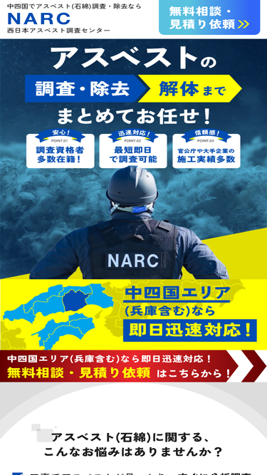 86%アスベスト(石綿)の調査・除去・解体なら西日本アスベスト調査センター(NARC)へお任せください。西日本アスベスト調査センターは長年培った経験と実績があり、解体の全ての工程を任せられる資格を保持しています。ご依頼から最短でご報告書を提出いたしますので、お気軽にご相談ください。