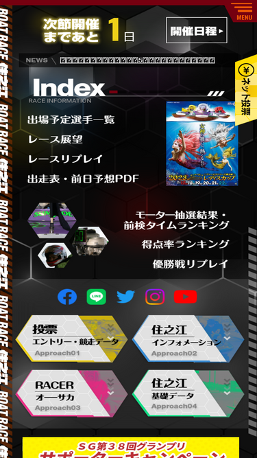ボートレース住之江の公式サイトです。レースライブをはじめとした映像配信やリアルタイムレース情報、最新トピックスなどボートレース住之江を楽しめる情報が満載です。