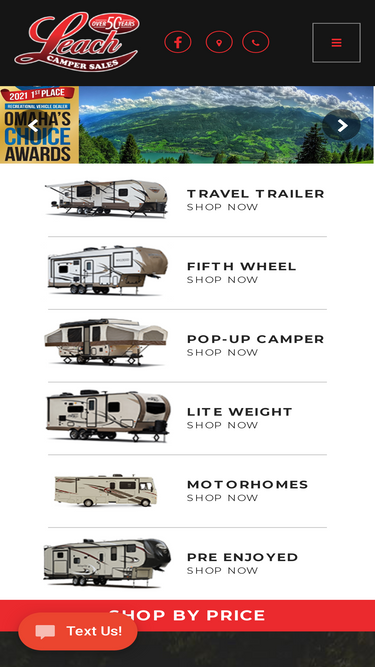 leach camper sales is an rv dealership located in council bluffs, ia. we sell new and pre-owned travel trailer, fifth wheel, pop-up camper, lite weight and motorhomes from prism, torque, winnebago, montana, leprechaun, cougar, wildwood, cyclone, heritage glen, freelander, trail runner and roo rockwood with excellent financing and pricing options. leach camper sales offers service and parts, and proudly serves the areas of treynor, la platte, chalco and honey creek.