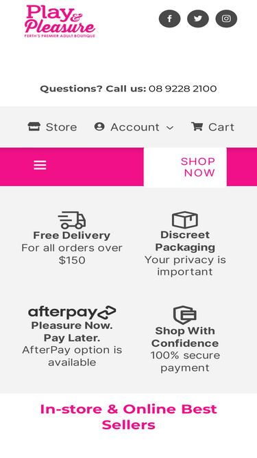 ONLINE STORE ONLY - NO PHYSICAL ADDRESS. Perth Sex Toys 24/7 are your round the clock delivery specialists. Bringing you sex toys, lingerie, and party goer packs in under 3 hours - all day, every day. Call us now 0435 805 449.