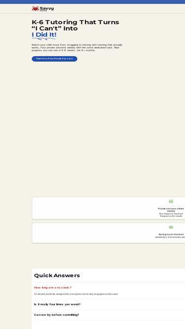 Get answers about Savvy's online tutoring for K-6 learners by reviewing our FAQ page. Learn about safety, pricing, session length, progress timeline, and how our coaching works. Try free.