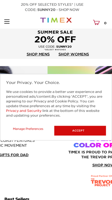 75%For California specific privacy policy, please click here Timex.com, Inc. (“Timex”, “we”, “our” or “us”) values the trust you have placed in us. As part of our relationship, we recognize and respect your privacy. That is why Timex is committed to protecting your privacy and using the information you share with us respo