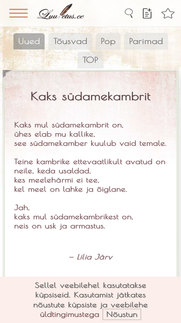 eesti suurim luuletuste valimik. iga päev uued luuletused, mida sa kuskilt mujalt ei leia. sünnipäeva luuletused, jõulu luuletused, naistepäeva, emadepäeva, isadepäeva, valentini ja isegi absurdsed luuletused
