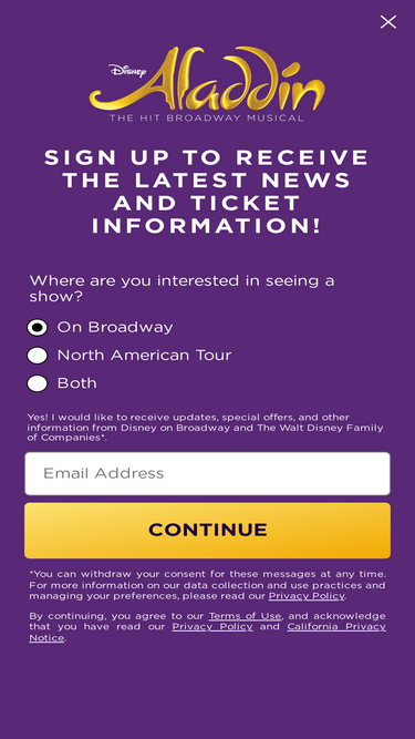 Disney's official site for tickets and information to the hit Broadway musical ALADDIN in New York City and on tour across North America!