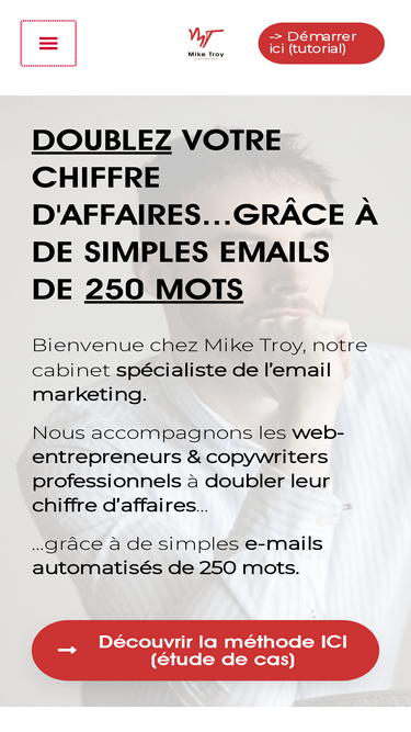 +180% de Chiffre d’Affaires…avec de simples emails de 250 mots Bienvenue chez Mike Troy, notre cabinet spécialiste de l’email marketing. Nous accompagnons les web-entrepreneurs & copywriters professionnels à augmenter leur chiffre d’affaires de +180%… …grâce à de simples e-mails automatisés de 250 mots. Découvrir la méthode ICI (étude de cas) Ils nous font confiance: emails de vente rédigés 0 + […]