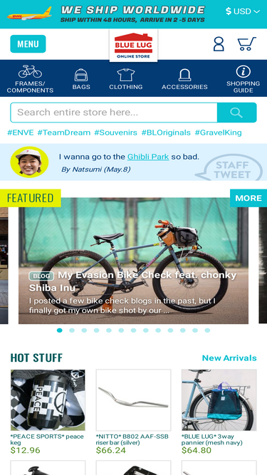 We ship worldwide from our online store. BLUE LUG is a bike shop based in Tokyo. Everyday bikes, fixies, cross bikes, MTBs, touring bikes... You name it, we got’em! We have the world’s richest variety of Bike parts, clothes, and goods.