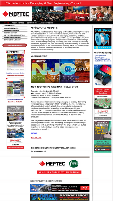 the official website of meptec.org. meptec (microelectronics packaging and test engineering council) is a trade association of semiconductor suppliers and manufacturers, committed to enhancing the competitiveness of the back-end portion of the semiconductor business.