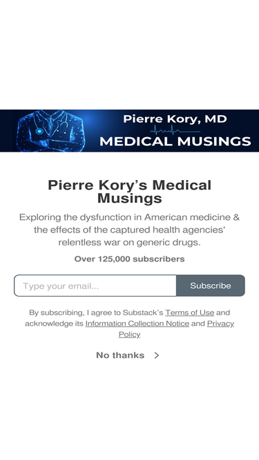 Exploring the dysfunction in American medicine & the effects of the captured health agencies' relentless war on generic drugs. Click to read Pierre Kory’s Medical Musings, by Pierre Kory, MD, MPA, a Substack publication with hundreds of thousands of subscribers.