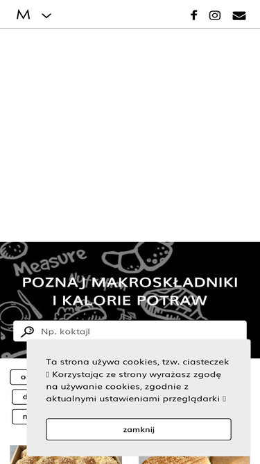 Przepisy z podaną kalorycznościa potrawy oraz wartościami odżywczymi takimi jak białka, węglowodany i tłuszcze.