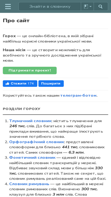 73%тлумачення, словозміна, транскрипція, синоніми, фразеологія, етимологія, переклад, римування, морфеміка. горох — це сервіс, в якому зібрані найбільш корисні словники української мови.