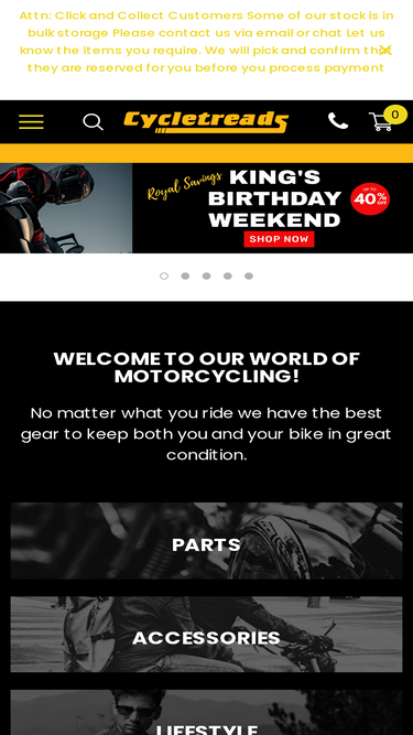 Buy motorcycle parts and accessories online from Cycletreads. Check out our website for great specials and one day deals. Local experts and leading brands, providing great service since 1987.