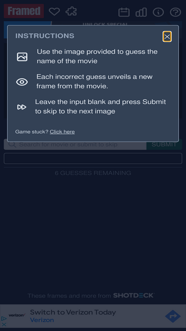 Guess the movie from 6 frames. Come back each day to see if you can guess the daily movie, or visit the archive to answer the days that you missed!
